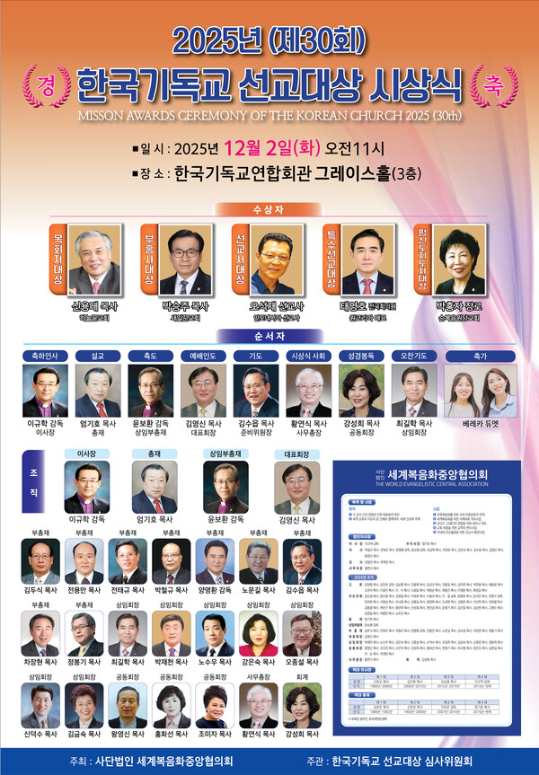 사단법인 세계복음화중앙협의회(대표 김영신 목사)가 주최하고 한국기독교 선교대상 심사위원회가 주관하는 ‘2025년(제30회) 한국기독교 선교대상 시상식’이 오는 12월 2일(화) 오전 11시, 한국기독교연합회관 그레이스홀(3층)에서 거행된다. 이번 시상식은 한국교회의 선교 현장을 묵묵히 지켜온 이들에게 감사를 전하고, 다음 세대에 선교적 사명을 계승하기 위한 의미 있는 자리로 마련됐다.